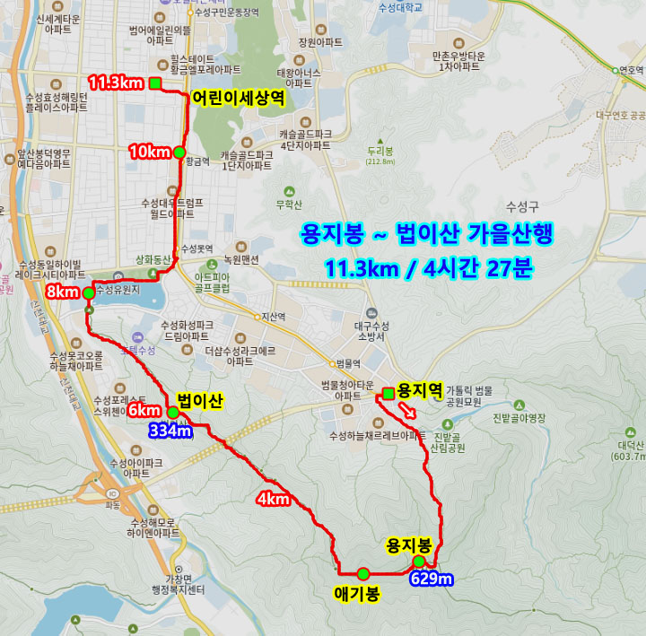 자주 올라갔던 용지봉(629m)~법이산~수성못을 돌아 집앞까지 걸어오는 11km 구간을 만들어 단독출발을 하게