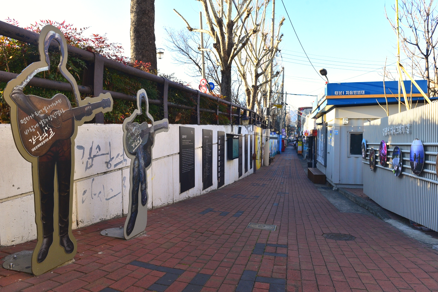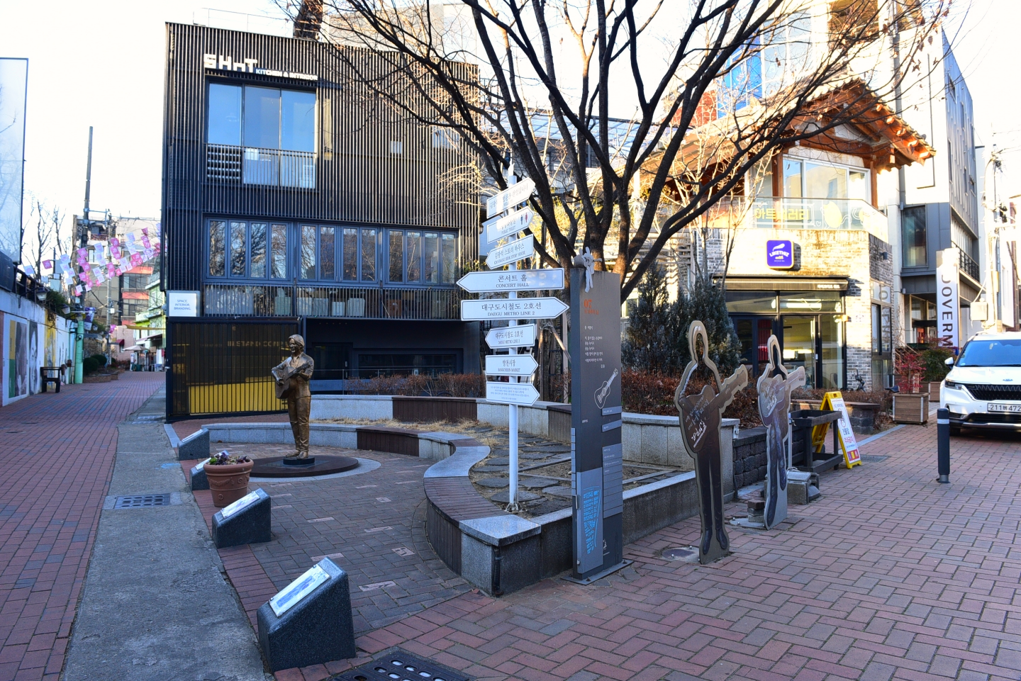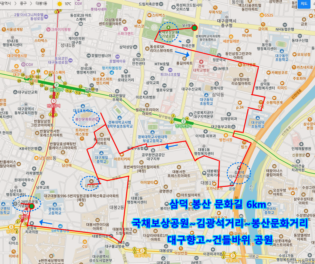 대구의 역사를 품고있는 중구 골목투어 안내도 ... 5개 코스중 4개 코스만 걷기로하고 ...삼덕 봉산 문화길 로드맵 ... 국채보상공원에서 건들바위 공원까지를 먼저 올려본다4개코스 종점인 달성공원에 주차후 ... 출발지까지 카카오 택시로 이동07:35 // 잠시후 국채보상기념공원에 도착,송구영신 타종을 울리는 달구벌 대종 앞에서 트레킹 출발 ...한국은행 대구지점 화폐전시장 지난다.화폐전시장은 트레킹을 마치고 오후에 찾아봤는데 진행상 먼저 4장정도 올려둔다분량이 많아 나중에 별도로 올리기로 하며 현재의 화폐 교체기(1960년) 화폐를 대표로 올려본다실제 5만원권 지폐로 3억원, 5억원의 크기와 무게등을 살펴본다5만원권 5억원이면 약 10kg의 무게 ...한국은행에서 도로를 건너면, 경북대학교 의과대학이 세월의 무게를 가늠하며 자리를 지킨다잠시후, 어릴적(초등3년) 살았던 동네 ... 아직 적산가옥들이 남아있고그리고 초등3~4학년때 다녔던 삼덕 초등학교 교정학교에서 50m 거리의 가운데 높직한 건물, 저 건물(당시 대구은행 수성교지점)은 50여년전 첫 직장생활을 하던 곳이라 또 감회가 ...도로를 건너면 김광석 거리가 350m 정도 길게 이어진다김광석(1964~1996), 이곳 대봉동에서 태어나 32세의 젊은 나이에 세상을 떠난 가수 김광석의 거리 ...통기타 가수 김광석을 그리워하며 세워진 이 거리는 젊은이들의 산책코스로 유명하고 ...한쪽 벽면 전부를 김광석 추모거리로 ...버스킹 공연장도 설치 ...당시 젊은이들의 입영열차 ...포토존당시 학생들의 짝사랑 ...김광석거리에서 대봉동 젊음이들의 거리 ... 독특한 건물과 맛집들로허름한 옛 건물들을 이용한 독특한 식당 ...4개월 후, 6월달이면 붉은 능소화가 흐드러지게 피는 대봉동 능소화 폭포 ...1년전(2025.6.28)에 담은 능소화 폭포 사진을 소환하여 올려본다능소화 폭포에서 300m, 도로 하나를 건너 필자가 졸업한 모교 교정을 찾았다(아파트 단지내 보존)55년만에 찾아온 옛 모교, 아파트가 들어서면서 학교가 이전할때 교정이 없어진 줄 알았는데, 역사적인 건물이라 본관만 보존 ...오늘 함께한 9년 선배님, 모교 동문 선배님이시고 20여년전에 모교 교장선생님으로 재직하셨던 분이시다대봉동에서 이웃한 봉산문화거리의 문화회관을 지나 ...대구를 대표하는 문화 예술의 거리 ... 봉산교회 앞에서 제일중학교 방향으로 올라간다오랜 역사를 지난 제일중학교를 지나 100m 정도 내려가면조선초기(태조 7년)에 세워진 대구향교를 만나게 된다교동에 창건되었으나, 임란때 소실되어 달성공원으로 이건하였고 ... 일제 강점기때 이곳으로 이전낙육재(樂育齋) ... 인재양성으로 설립하여 유능한 선비들을 선발, 학문연구의 산실역할을 한 곳이다명륜당 ... 유학을 가르치던 강당으로 많은 학자와 정치인들을 배출향교에서 500m쯤 내려오면 건들바위 역사공원으로 도착...건들바위 역사공원 ... 현재는 도로가 나 있어 당시의 모습은 없지만 예전에는 대구를 관통하던 하천이었다옛 하천이 흐르던 장소가 일부 보존되어 있는데물에 깍여진 바위들이 당시의 하천 위용을 말해주네요대구에 살면서도 자세히 알 수 없었던 옛 흔적들을 발견하는 재미가 솔솔하다앞에 보이는 바위가 건들바위 ... 이 앞으로 대구천이 흘렀고 암벽의 균열과 침식작용으로 현재 모습이 ...건들바위를 지나 명덕네거리 228민주운동기념회관으로 가면서 삼덕봉산 문화길 탐방을 엔딩 ... 후편에 계속한다오늘 걸어간 4개코스 16.6km 전체 지도 (우측 국채보상기념공원 ~ 좌측 달성공원까지)트랭글 GPS 기록