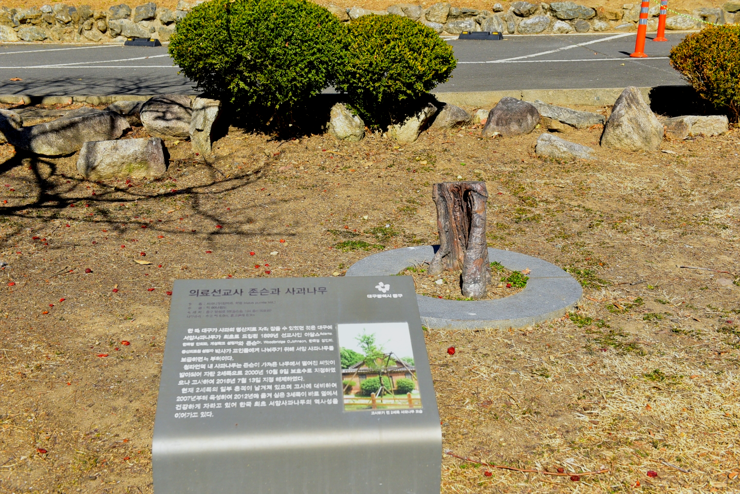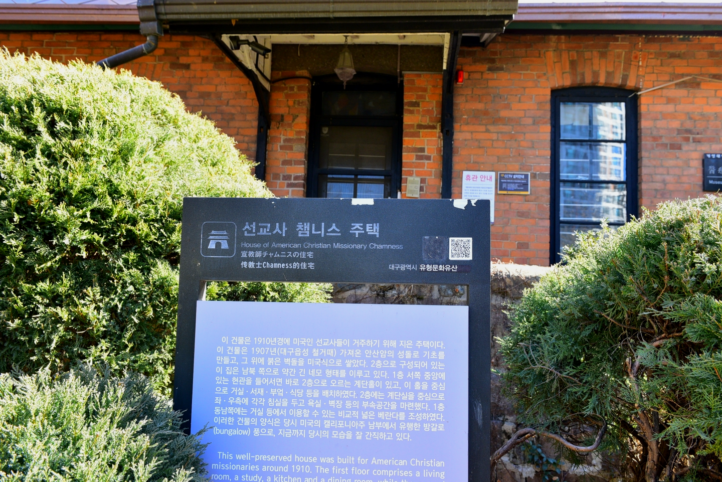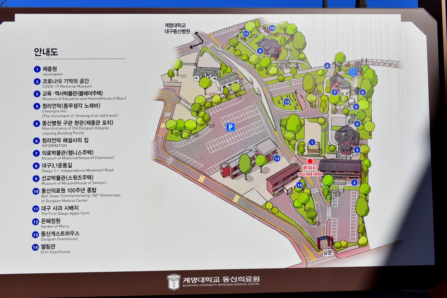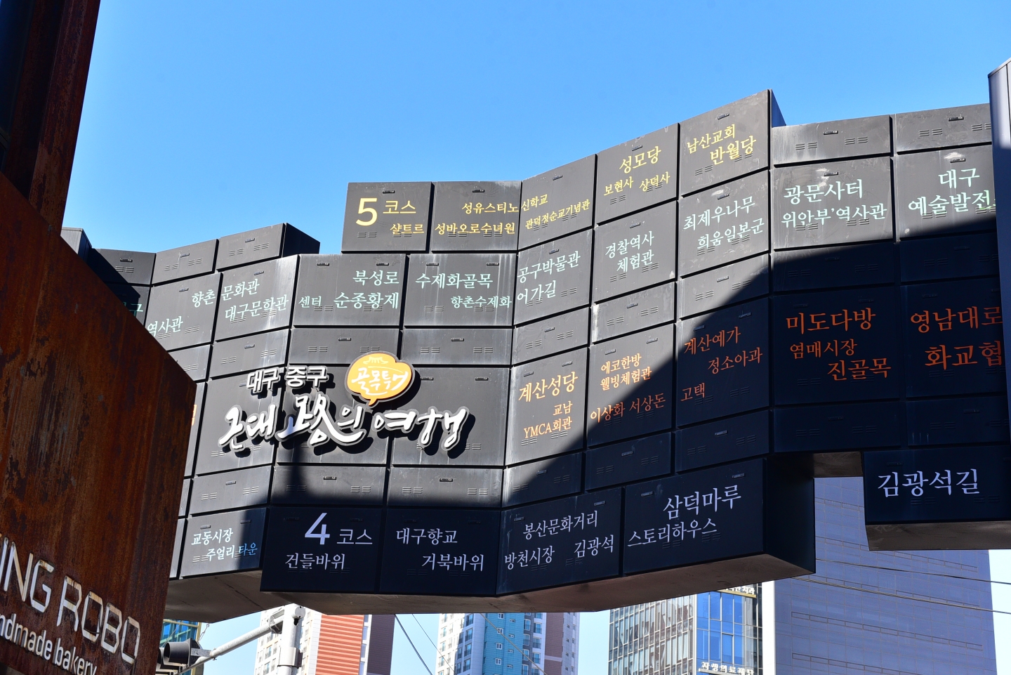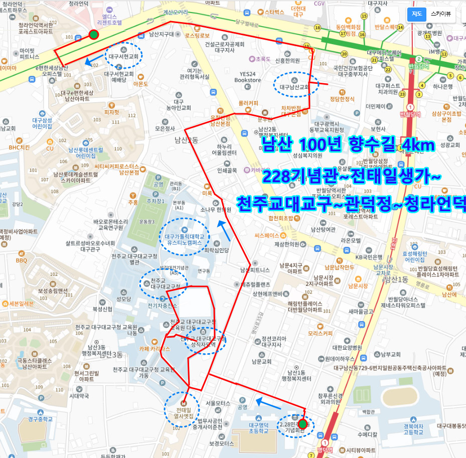 남산 100년 향수길 ... 트레일 맵남산 100년 향수길의 출발지 ... 2.28민주운동 기념회관1960년 대구학생들이 주도한 2.28운동 ~ 3.15마산의거 ~ 4.19 민주혁명으로 연결 ...전태일 열사 옛집으로 가는 골목길 ...1970년, 22세의 젊은 나이에 열악한 노동환경과 부조리함을 고발하며 분신한 노동운동가 "전태일 열사 옛집"먼저간 아들의 뜻을 이어 노동자 권익증진에 여생을 바친 전태일 열사의 어머니 이소선 여사 (2011년 별세,81세)전태일 열사 옛집에서 30m 떨어진 ... 천주교 대구 대교구청 건물로 들어가며3만여평의 넓은 부지에 ... 교구청 교육원과 숙소, 남산성당과 김대건기념관, 성직자 묘역등이 있다모두 둘러보기에는 시간이 촉박하여 성직자 묘소방향으로 ...1931년에 건립된 안익사(安益舍) ... 교구 성직자들을 위한 병원 건물인데, 팔공산 지묘동에서 이곳으로 옮긴 건물이다이곳에 대구 대교구가 세워지기까지 발걸음 / 4사람이 시작하여 ... 현재 164개 본당, 51만 4천명의 신자로 성장성직자 묘소 ...대충 헤아려보니 ... 모두 83기의 묘비가 세워져 있고가장 오래된 묘비 ... 알퐁스 조야우 선교사(1877~1907), 30세에 선종하셨으니 순교를 하신 듯 ?에티엔느 샤르제뵈 선교사(1867 ~ 1920)100년의 역사를 가진 묘역을 둘러보며 ...남산동 인쇄골목을 지나간다대구.경북 인쇄산업의 중심지로 2000년도 초까지 1,000여개의 업체가 밀집되었다네요1914년에 창립, 112년의 역사를 가진 반월당 남산교회를 지나 ...영조 25년에 세운 관덕정 건물은 군사조련과 사형장으로 사용하였으며 1815년 을해박해때 7명이 순교하였으며이후 기해박해, 병인박해 등으로 10명이 순교하였다.천주교 박해당시의 신앙서적과 사용 기물들관덕정을 떠나 대신동 근대문화골목 투어길로 이동 ...동산병원 뒷편 청라언덕길로 ...제중원(초가집) ... 1899년 선교사들이 세운 대구 최초의 서양식 병원여기는 100년의 시간을 거슬러 올라가는 대구 최초의 기독교 선교거점지역이다청라(靑蘿)언덕 ... 푸른 담장이(청라)가 덮힌 언덕선교사 블레어 주택 (후면)1910년에 미국 선교사들이 지은 ... 선교사 블레어 주택 전면청라언덕과 동무생각 ... 익숙한 노래들이다100년의 세월만큼이나 간극이 벌어진 청라언덕과 주변 빌딩들선교사 챔니스 주택 ...의료박물관 ... 당시 의료. 교육. 신앙의 출발점이 된 청라언덕청라언덕에는 대구 최초의 교회인 제일교회가 세워져 있고 ...선교사 스윗즈 주택 ...스윗즈 선교사 주택을 돌아가면 ...대구의 사과재배는 1899년, 동산의료원을 설립한 존슨 선교사와 계성학교를 설립한 아담스 선교사가 미국에서 처음 들여와서 식재최초의 사과나무를 들여온 존슨 선교사 사과나무 ... 후편에서 계속운동거리는 1코스 6km / 2코스 4km ....합산한 거리